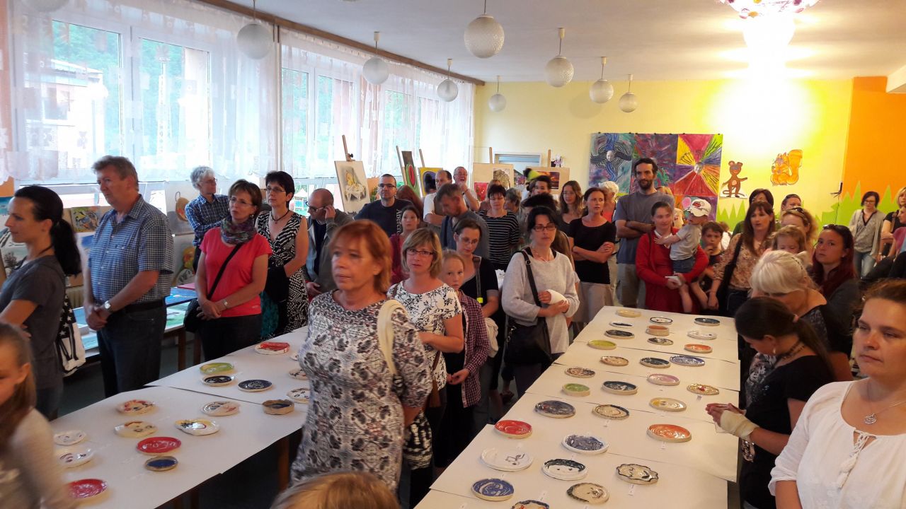 Součástí výstavy mělo být slavnostní odhalení velkých malovaných desek před školou, ale počasí nám nepřálo. Ještě že paní starostka ovládá umění improvizace a nakonec jsme s její pomocí dílo přece jen odhalili, i když prozatímně jen v jídelně.