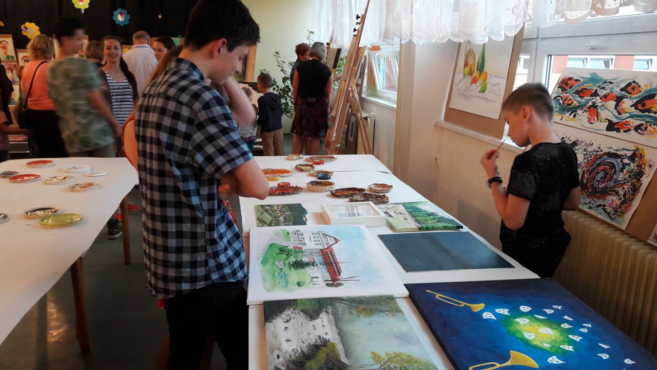 Ale zpátky k výstavě. Všichni příznivci výtvarna mohli spatřit keramické talíře inspirované tvorbou Pabla Picassa, zátiší namalované mastnými pastely, pohledy na krajinu v okolí Chocerad, zvláštní autoportréty a taky absolventské práce Anny Jeništové, Matěje Pavlíčka a Adama Vávry. Anička vystavila soubor černobílých suchých pastelů, Adam namaloval bájného Fénixe a Matěj se představil souborem fotografií. Dospělí vystavili olejomalby na plátně, které již brzy budou ke spatření celoročně v Penzionu Jaro.