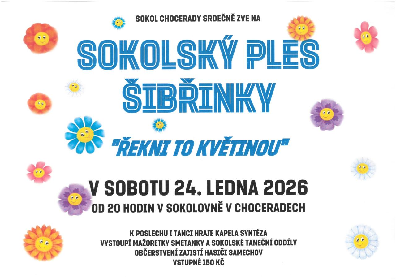 TJ Sokol Chocerady srdečně zve v sobotu 24. ledna 2026 na sokolské Šibřinky. Uskuteční se od 20 hodin v sokolovně. K poslechu i tanci hraje kapela Syntéza.